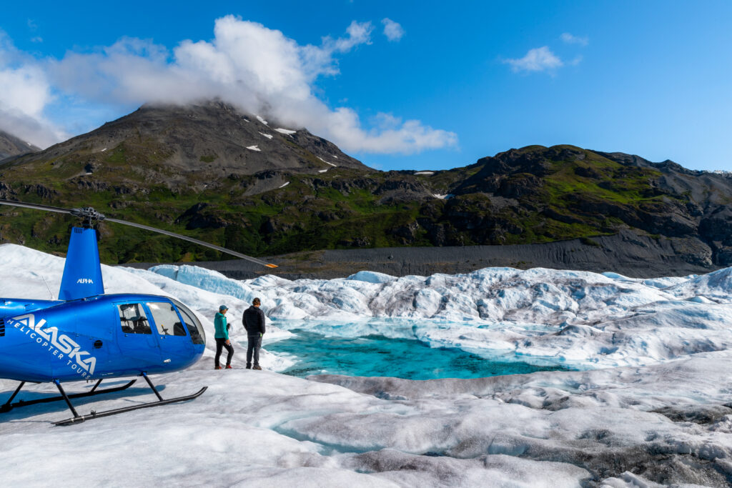 After an hour, the helicopter takes you down to the lower glacier, where you land again for a second tour. Here you explore the blue melt pools, crevasses, and other cool glacial features with your pilot/guide.