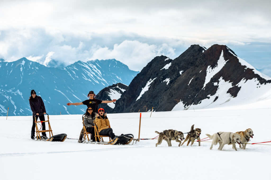The classic Alaskan adventure! Drive your own sled-dog team on real snow in the middle of summer surrounded by amazing scenery. Start this adventure with a spectacular helicopter ride over glaciers and icebergs. We often see moose, black bears, Dall sheep, and mountain goats. Land on a huge snow field high on a glacier and enjoy a whole hour with Alaskan sled dogs and their mushers that live here all summer long. Take the dog team for an exhilarating dogsled ride through real snow. You can stand on the runners and mush your own dog team if you want, or just sit on the sled and let the mushers run the team.